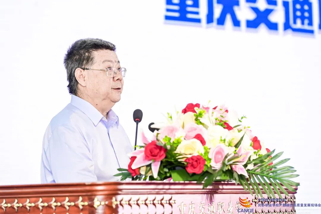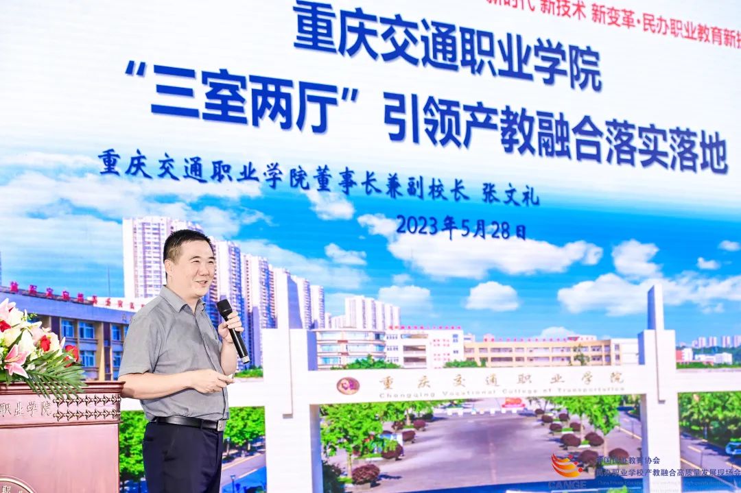 (重庆交通职业学院董事长张文礼以《“三室两厅”引领产教融合落实落地》为题作了交流汇报。)