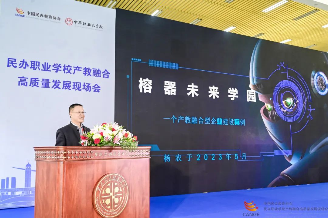 (中华职业教育社原副总干事杨农以《榕器学园——个产教融合型企业建设案例》为题作了主旨报告。)